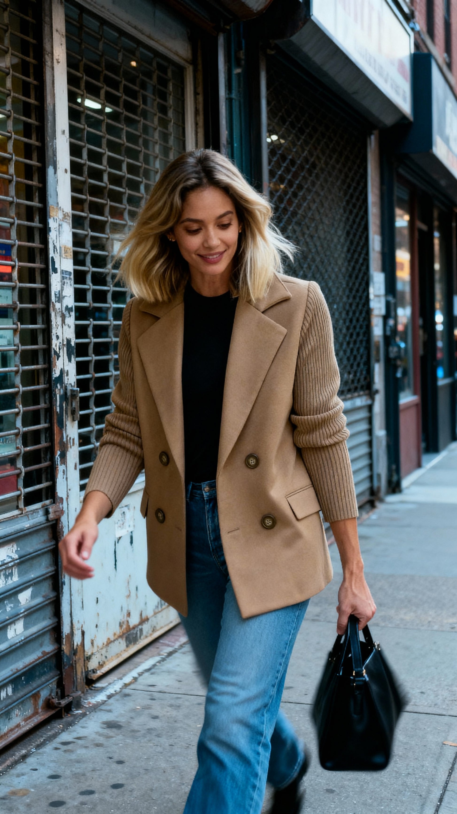 Design: Double-breasted front with structured body and soft knitted sleeves