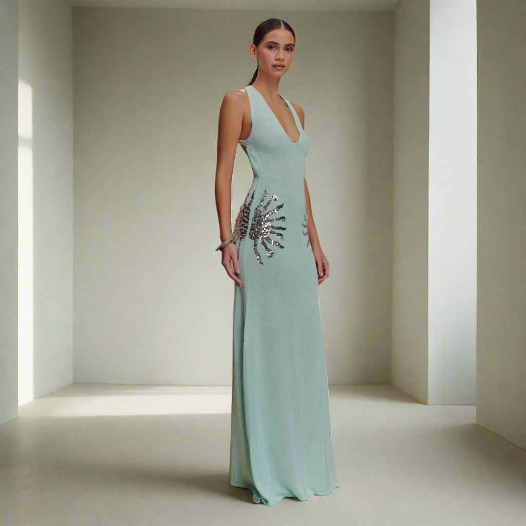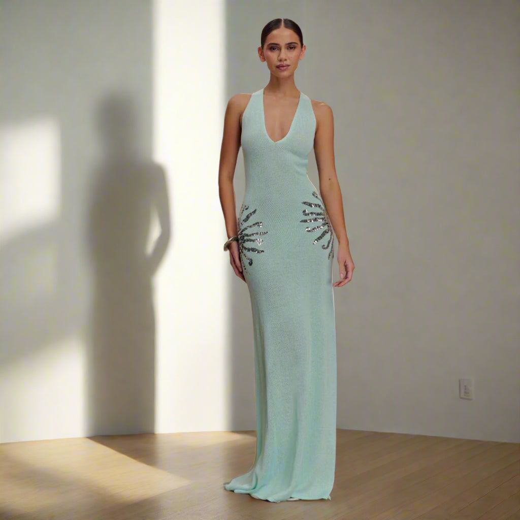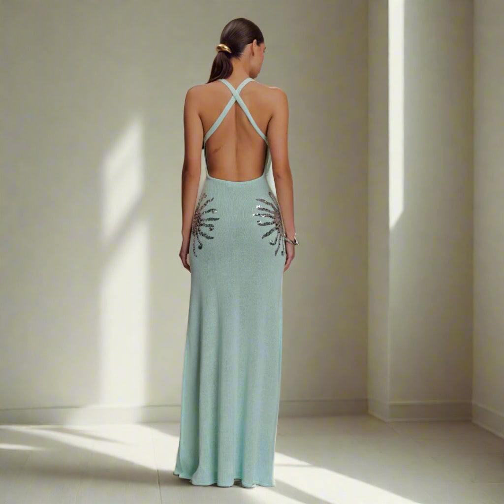 This ankle-length knit dress sparkles from sunset to midnight. Soft, unlined knit slips over you in a relaxed drape, while sequined sunburst details accent the hip. The open-back silhouette features crisscross straps and a flattering V-neck, blending comfort with statement shimmer.